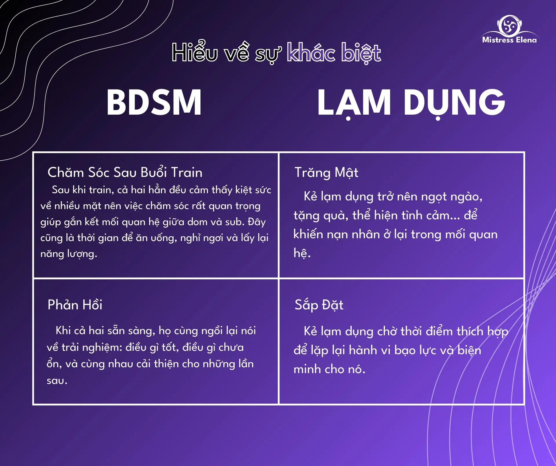 Như vậy, BDSM không đồng nghĩa với bạo lực hay lạm dụng. Khác biệt nằm ở sự đồng thuận, hiểu biết và tôn trọng lẫn nhau.