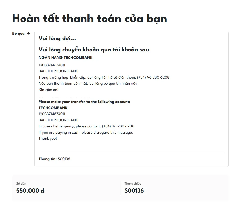 - Đúng số tiền & nội dung thanh toán (Mã đơn hàng "S00xxx") là điều cần thiết để xác nhận.